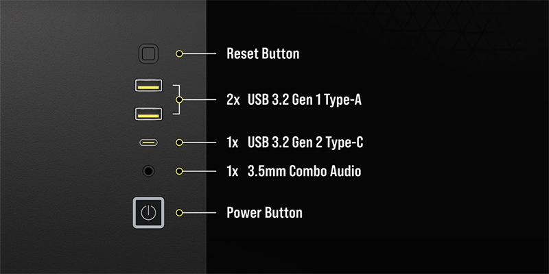 Case máy tính Corsair 2500X TG Black trang bị bảng kết nối phía trên vỏ máy, bao gồm 2 cổng USB Type A 3.2 Gen, USB – Type C 3.2 Gen 2 với tốc độ lên đến 10Gbps và cổng Audio/Mic mở rộng tiện lợi.