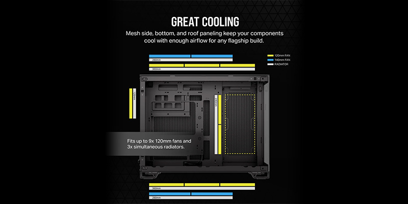 Case máy tính Corsair 2500X TG Black được thiết kế để gắn lên đến 9 quạt tản nhiệt 120mm, 6 quạt tản nhiệt 140mm cũng như khả năng lắp tản nhiệt nước ở mọi hướng, lên đến 360mm.