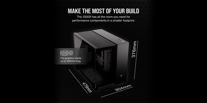 Tuy nhỏ gọn, Case máy tính Corsair 2500X TG Black vẫn có không gian đủ rộng rãi cho những GPU cao cấp, hỗ trợ chiều dài GPU lên đến 400m.