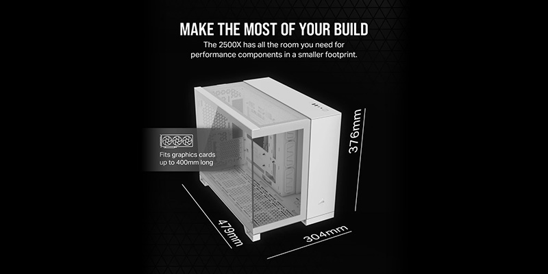 Tuy nhỏ gọn, Case máy tính Corsair 2500X TG White vẫn có không gian đủ rộng rãi cho những GPU cao cấp, hỗ trợ chiều dài GPU lên đến 400m.