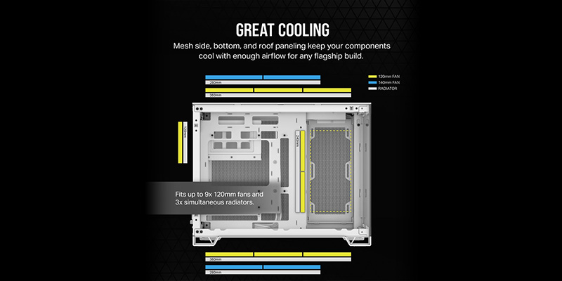 Case máy tính Corsair 2500X TG White được thiết kế để gắn lên đến 9 quạt tản nhiệt 120mm, 6 quạt tản nhiệt 140mm cũng như khả năng lắp tản nhiệt nước ở mọi hướng, lên đến 360mm.