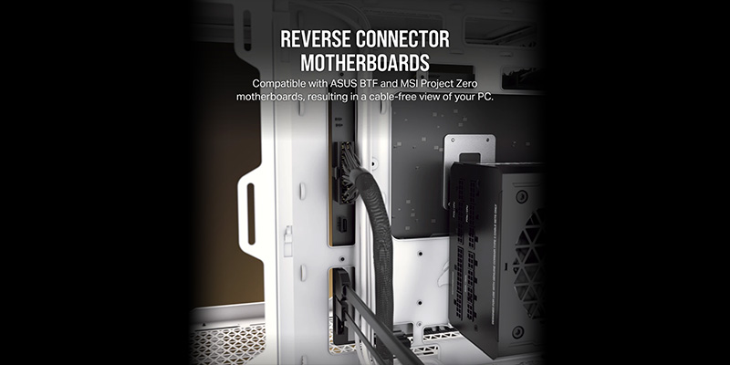 Case máy tính Corsair 2500X TG White tương thích với các dòng sản phẩm có cổng kết nối đảo ngược, bao gồm ASUS BTF, Project Zero và ICUE Link.