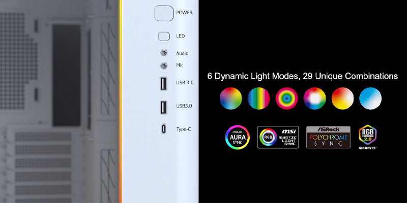 Case máy tính Montech King 95 White được trang bị đầy đủ các cổng kết nối, bao gồm 2 cổng USB Type A3.0, 1 cổng USB Type C tốc độ, 1 cổng HD Audio và 1 cổng Mic.