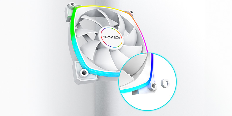 Fan Case Montech AX 140 PWMtích hợp 8 miếng đệm chống rung tròn của chúng tôi, giúp giảm độ rung và tiếng ồn do hiện tượng cộng hưởng.