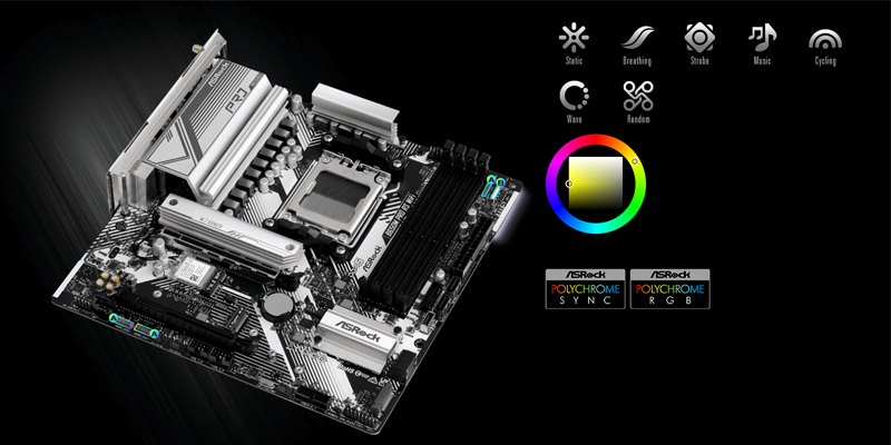 Ngoài hệ thống chiếu sáng RGB tích hợp, Mainboard PC ASRock B650M Pro RS Wifi còn có các đầu cắm RGB tích hợp và đầu cắm RGB có thể định địa chỉ cho phép kết nối bo mạch chủ với các thiết bị LED tương thích như dải, quạt CPU, bộ làm mát, khung máy, v.v. Người dùng cũng có thể đồng bộ hóa các thiết bị LED RGB trên các phụ kiện được chứng nhận Polychrome RGB Sync để tạo hiệu ứng ánh sáng độc đáo của riêng mình.