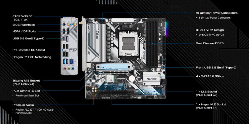 Mainboard PC ASRock B650M Pro RS Wifi cung cấp giao diện PCI Express 4.0 mới nhất và bo mạch cung cấp khả năng phân phối điện mạnh mẽ và làm mát hiệu quả, giúp khai thác tiềm năng của bộ xử lý AMD Ryzen 8000, 7000 mới nhất và Socket AM5.