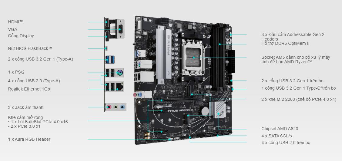 Mainboard PC Asus Prime A620M-A được trang bị đẩy đủ các cổng kết nối để bạn dễ dàng lắp đặt.