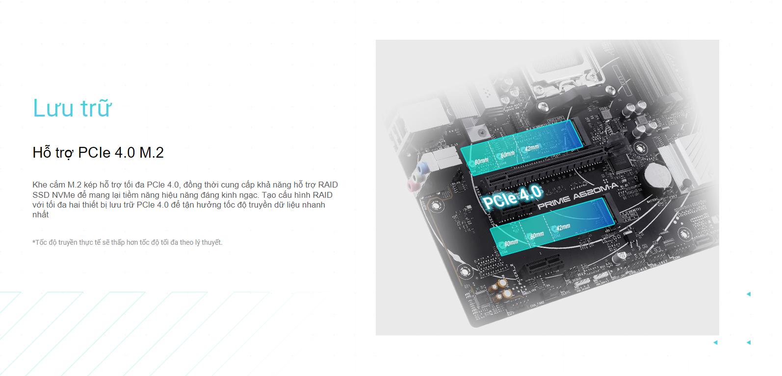 Mainboard PC Asus Prime A620M-A hỗ trợ khe cắm M.2 PCIe 4.0 và cung cấp hỗ trợ NVMe SSD RAID để tăng hiệu suất đáng kinh ngạc. Tạo cấu hình RAID với thiết bị lưu trữ PCIe để tận hưởng tốc độ truyền dữ liệu nhanh nhất trên nền tảng Intel thế hệ mới.