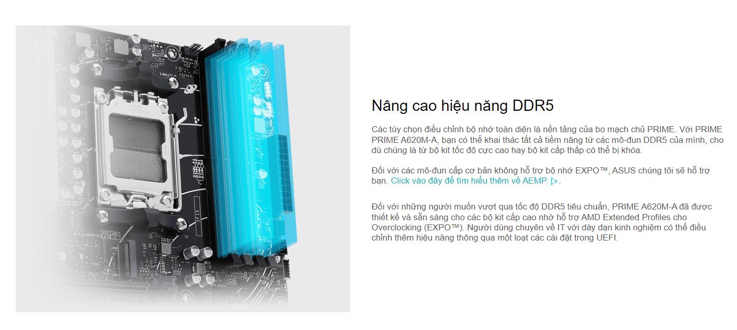 Mainboard PC Asus Prime A620M-Ahỗ trợ ép xung RAM DDR5 đến 7600+(O.C.) MHz, cung cấp khả năng truy cập băng thông bộ nhớ.