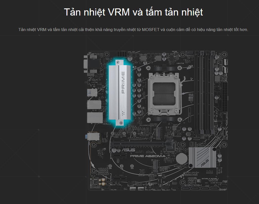 Để đảm bảo Turbo Boost tối đa và hiệu suất ép xung cho CPU thế hệ mới của AMD, Mainboard PC Asus Prime A620M-A trang bị thiết kế VRM tốt nhất từng được chế tạo với các linh kiện chất lượng cao nhất.